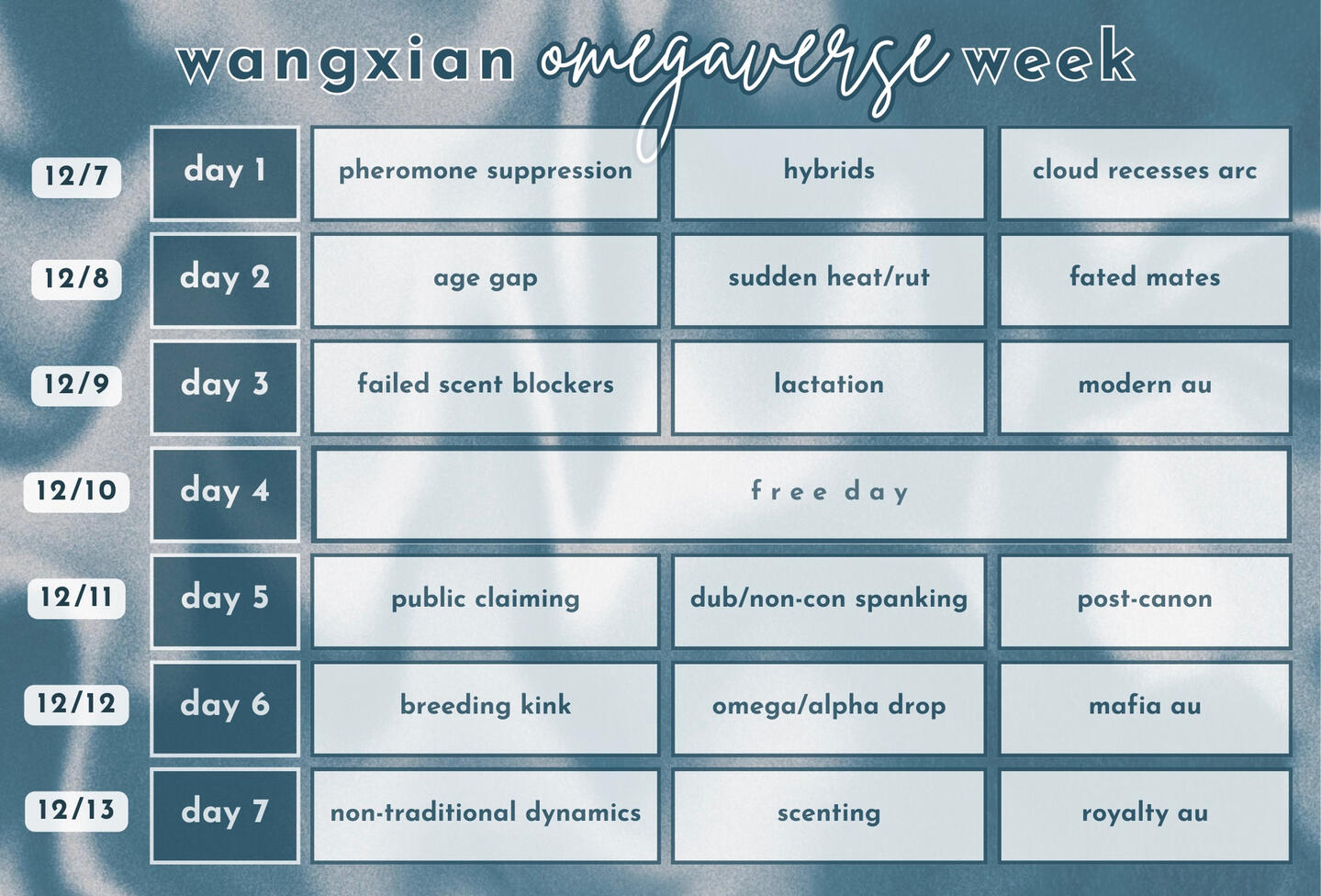 - post on your prompt’s day along with #wxomegaverseweek and @wxweek — if you post a fic on ao3, use the collection• what if i don’t finish my work in time?